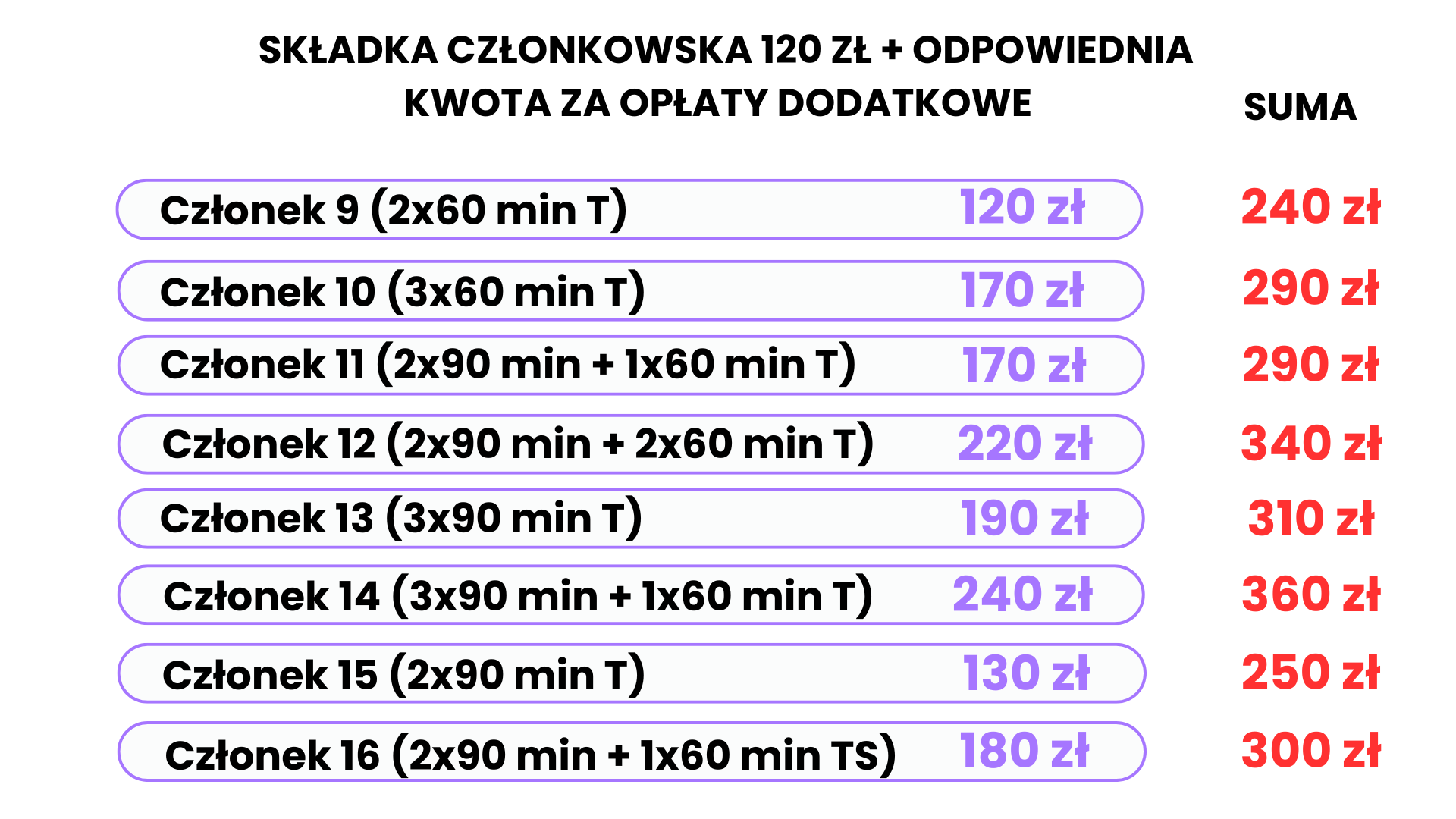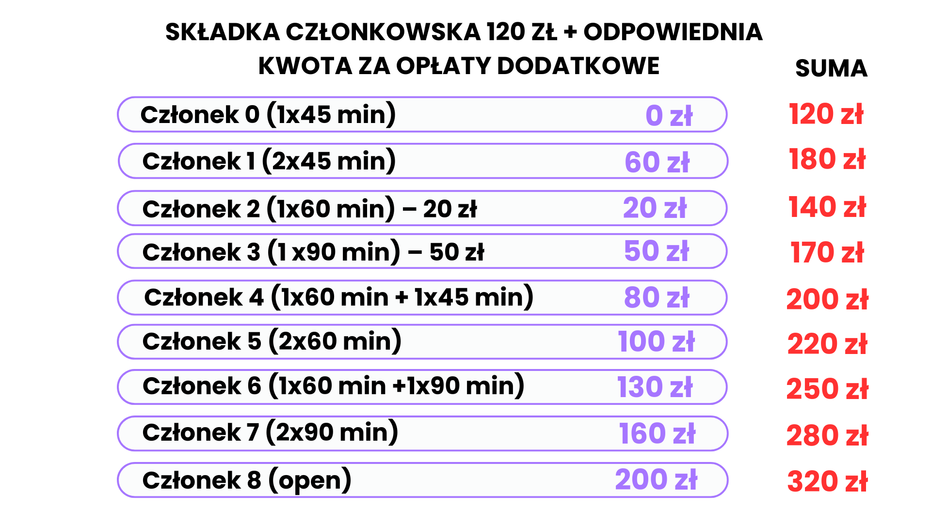 Opłata podstawowa wynosi 120 zł – członek 0 (1×45 min). Nazwa członka oraz wysokość opłaty wynika z przypisania do danej grupy zajęciowej i jest proporcjonalna do ilości zajęć.